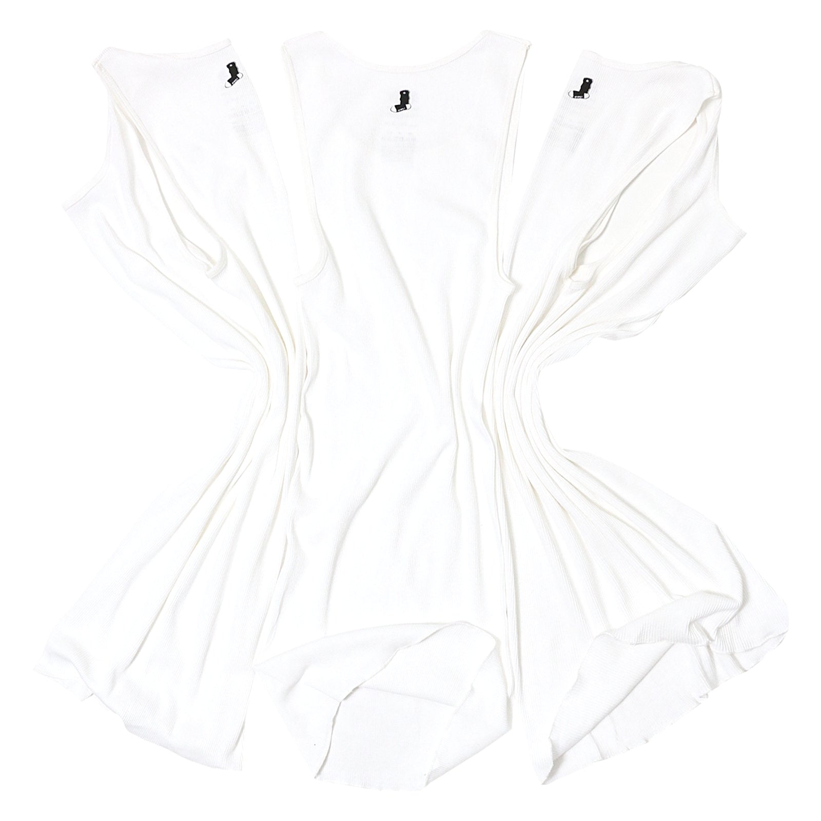 ご存知の方も多い''FRUIT OF THE LOOM''の3P タンクトップ、現在の仕様では無くなってしまった''OPEN HEM(裾リブ無し)''を過去の製法そのままにFRUIT OF THE LOOMに別注を依頼。 NON-RIBBEDなタンクトップ。