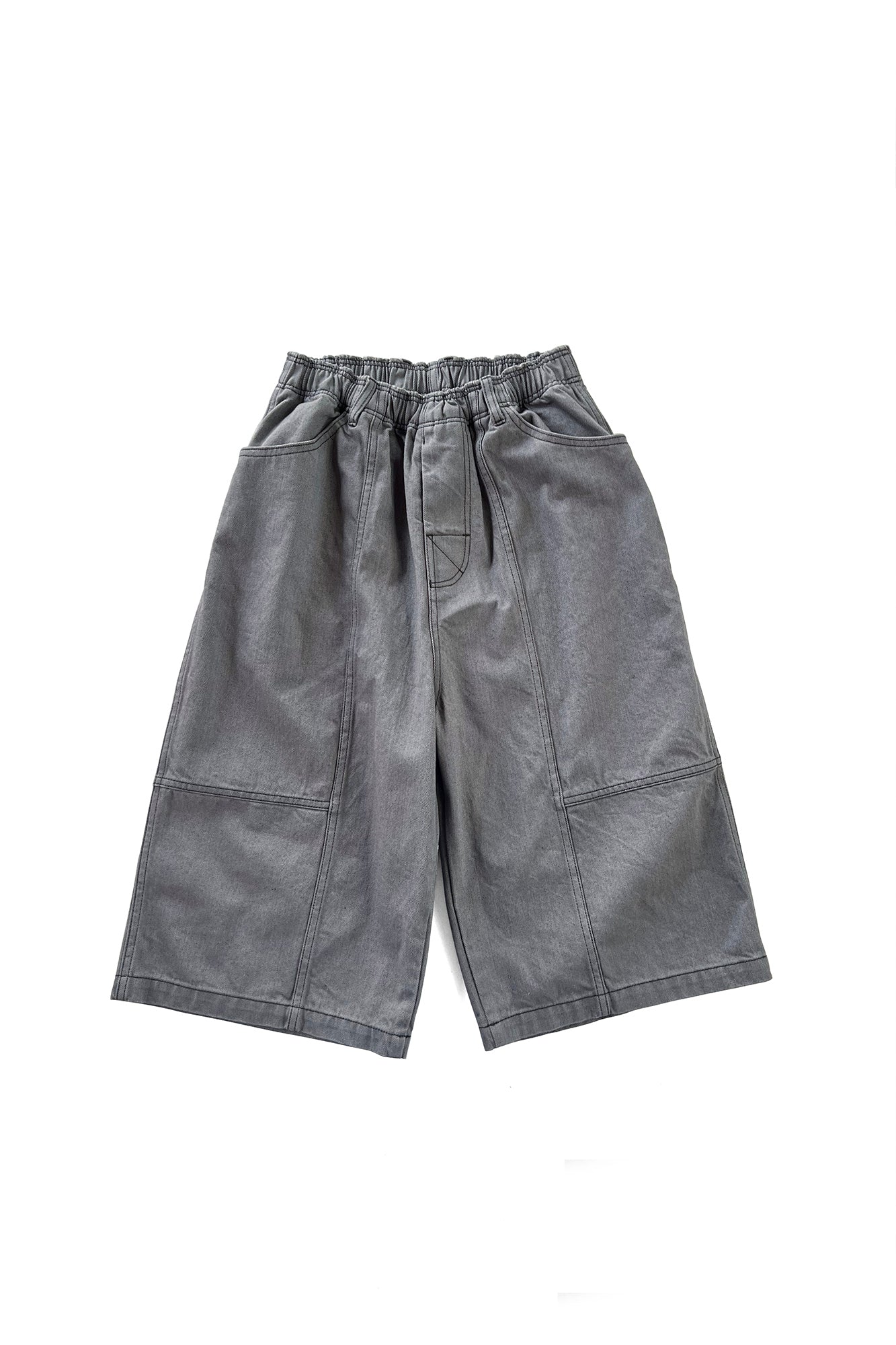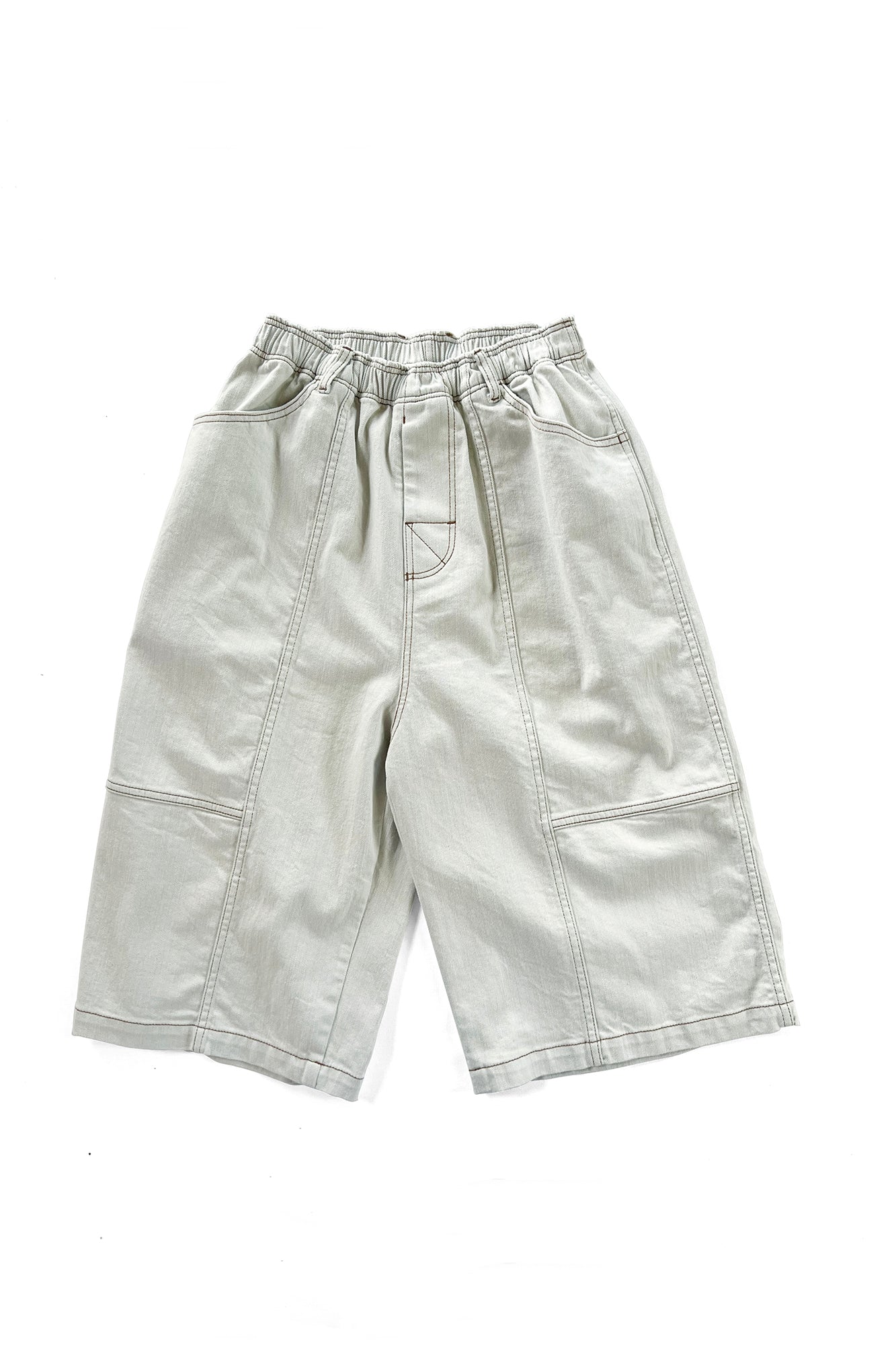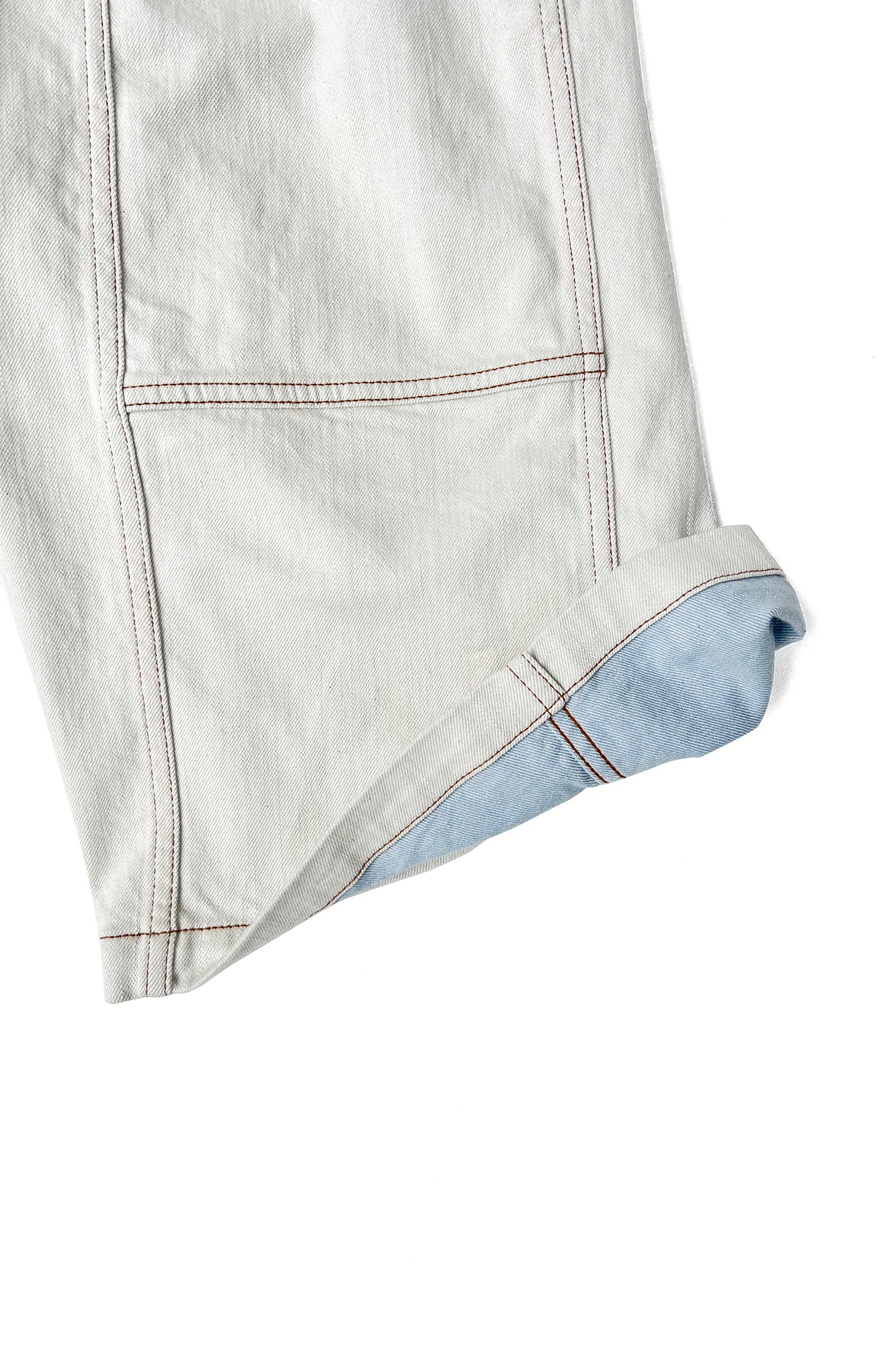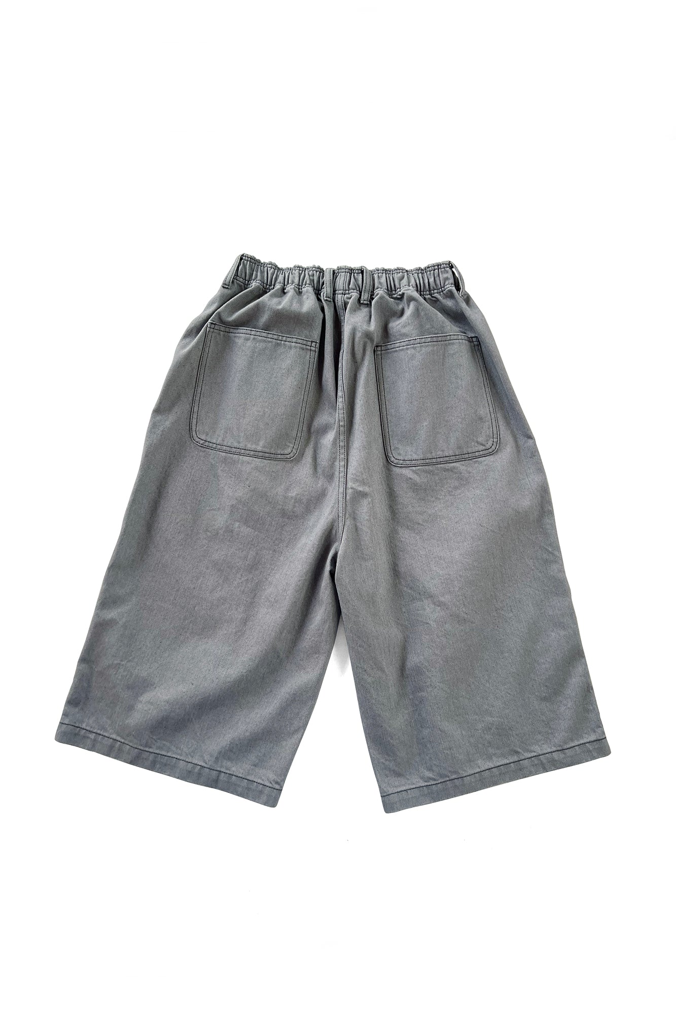 10ozのストレッチスノーデニムと12ozのムラ糸デニムを使用し股上を深く取ったバギーショーツ。