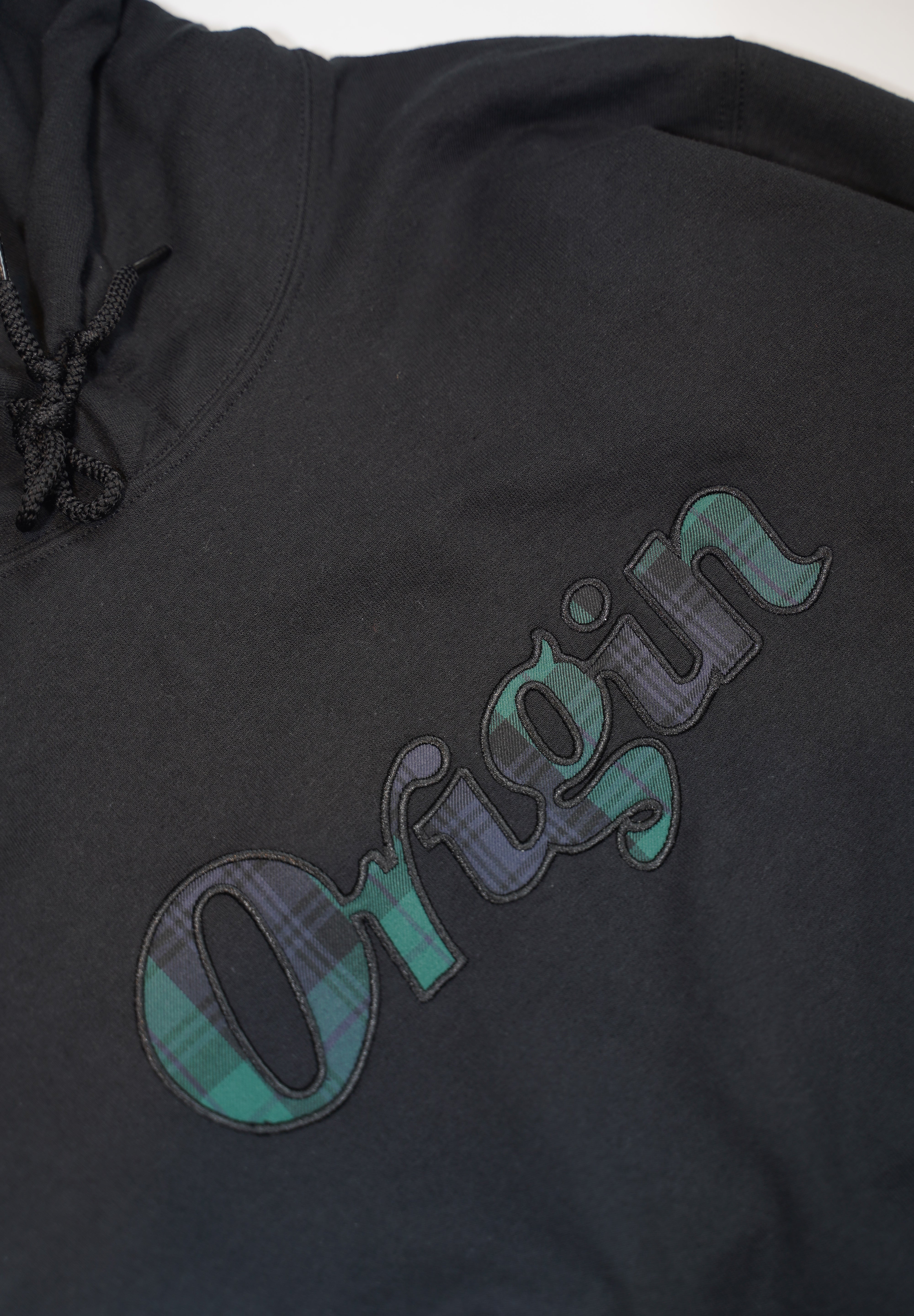 シンプルで使いやすいフーディーにOrigin Storeロゴをブラックウォッチカラーのアップリケでデザインしました。