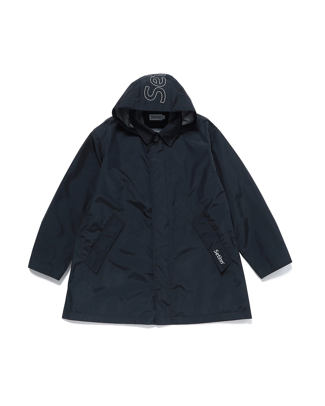 撥水性のある高機能素材を使用した、ミドル丈のコート。フード部分は取り外し可能で、ブランドロゴがリフレクタープリントされています。左のポケット口に反射糸で施されたロゴの刺繍入りでアクセントになっています。