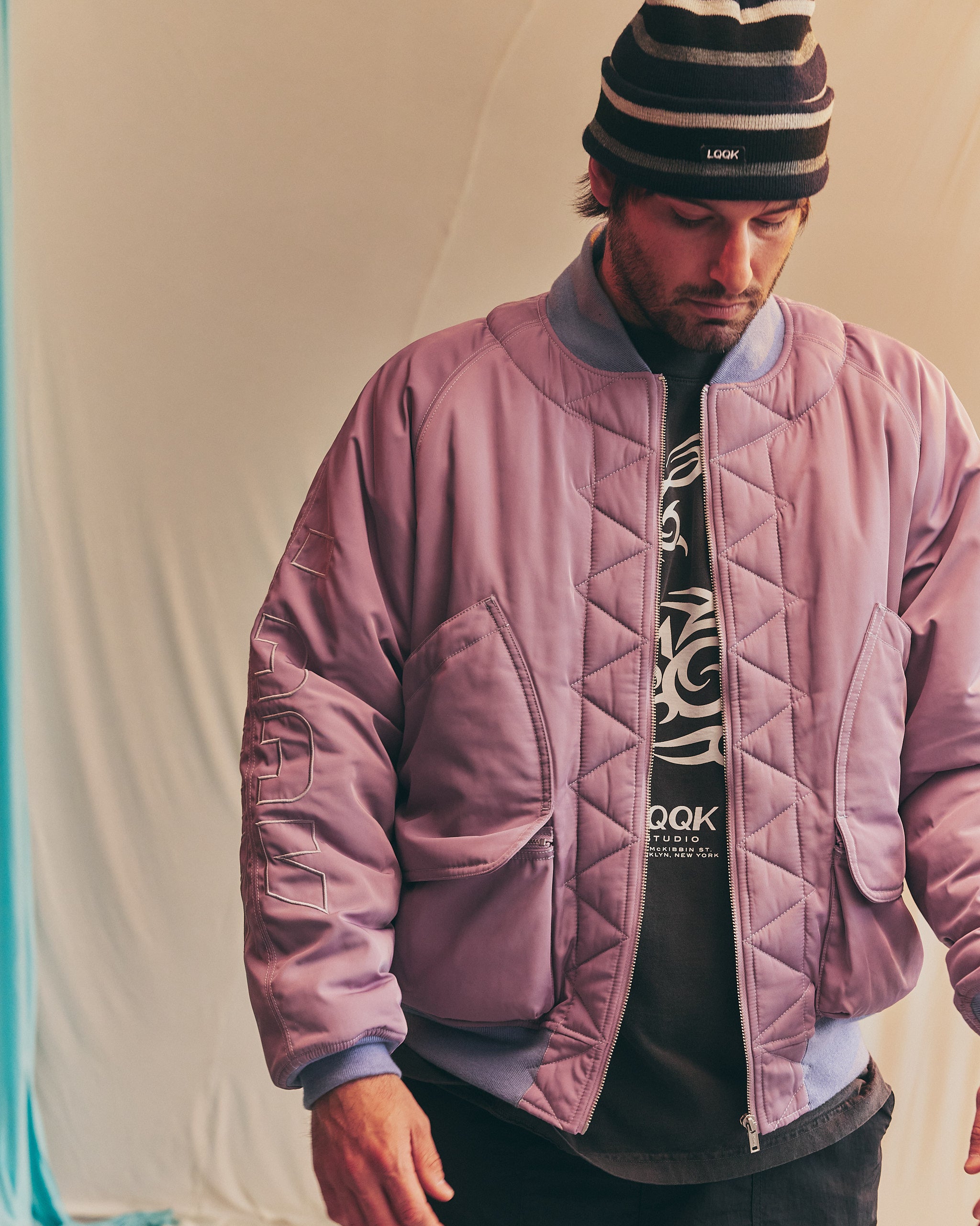 柔らかなピンクグレーのカラーが特徴のMA-1スタイルのジャケット。