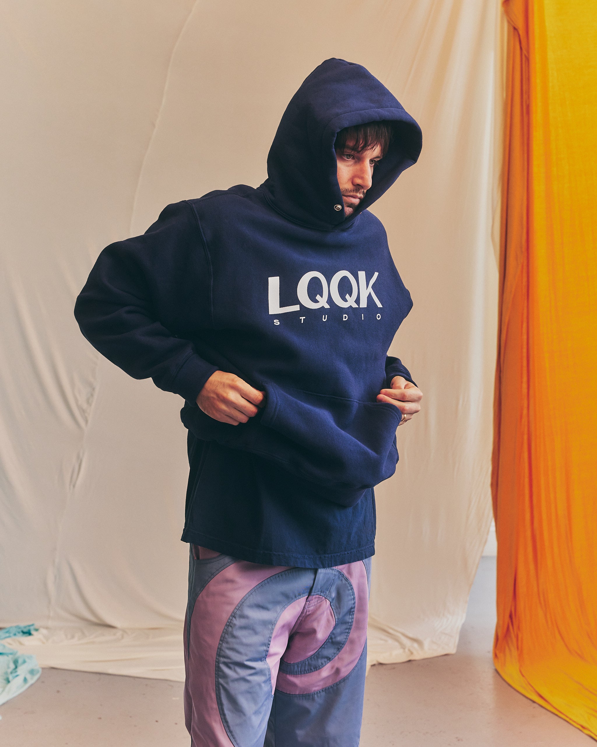 LQQKSTUDIO|SIGNATURE SNAP FLEECE HOODIE|NAVY