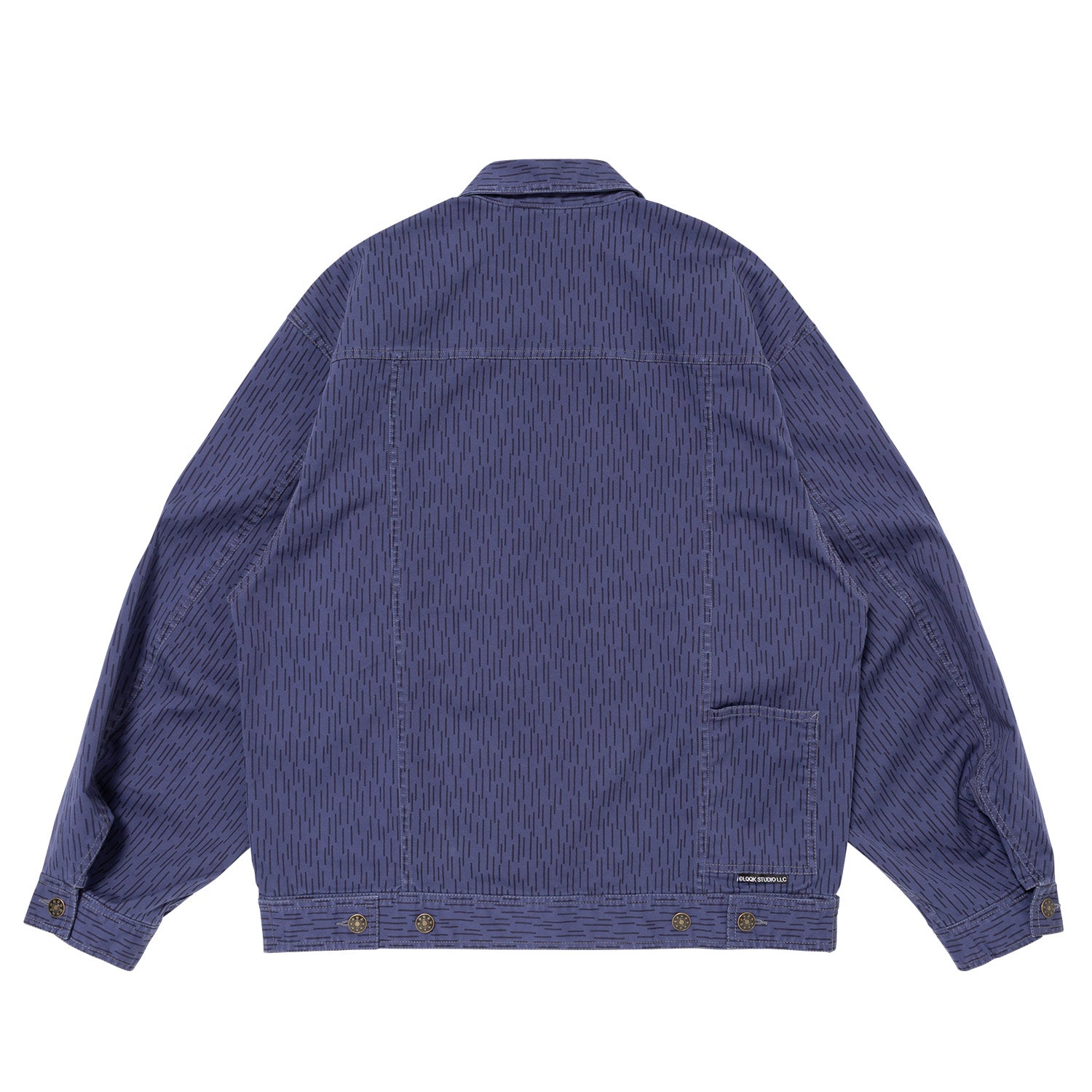 ネイビーベースに走る細かなドロップパターンが、作業着のような無骨さと都会的な空気感をミックスする。