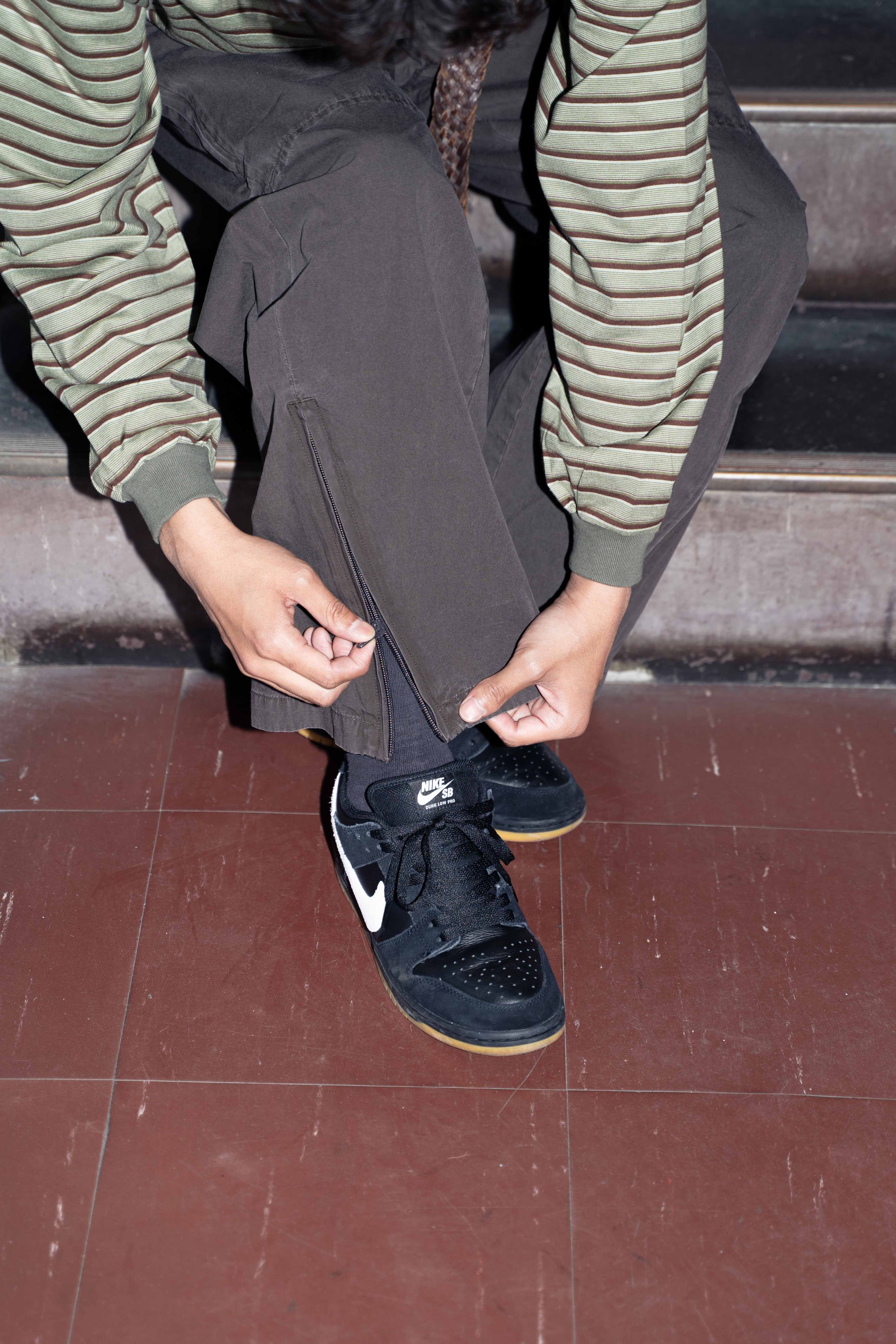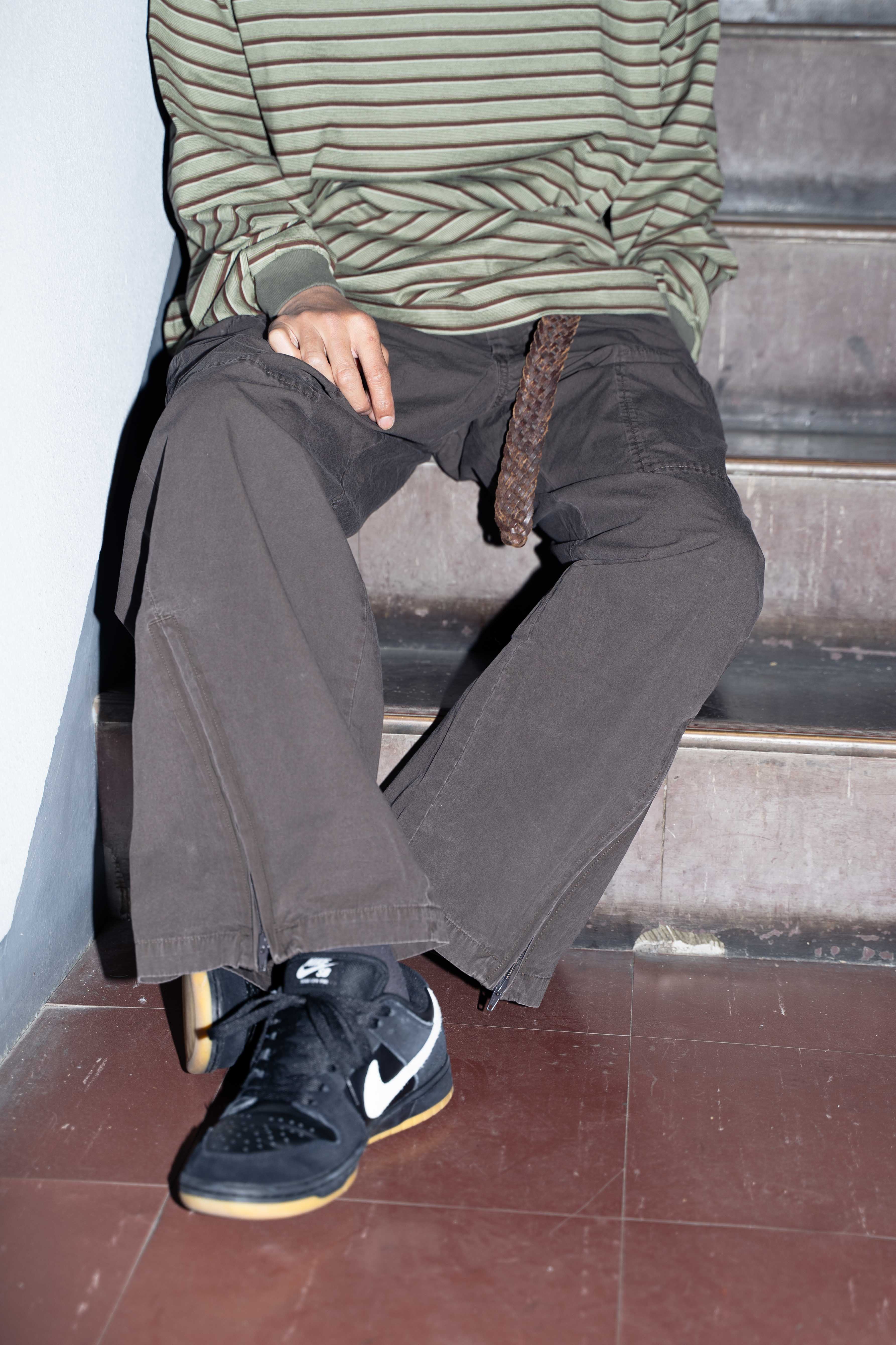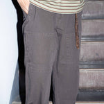 硫化染めのタイプライター生地を使用したイージーパンツ。